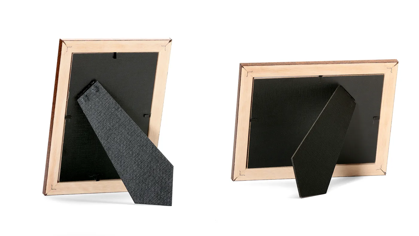 Per i formati più piccoli, è disponibile lo schienale con piedino (o cravatta). Questa soluzione permette di appoggiare la cornice su piani orizzontali senza bisogno di chiodi. Grazie alla particolare sagomatura del supporto, la stabilità è garantita in entrambi gli orientamenti